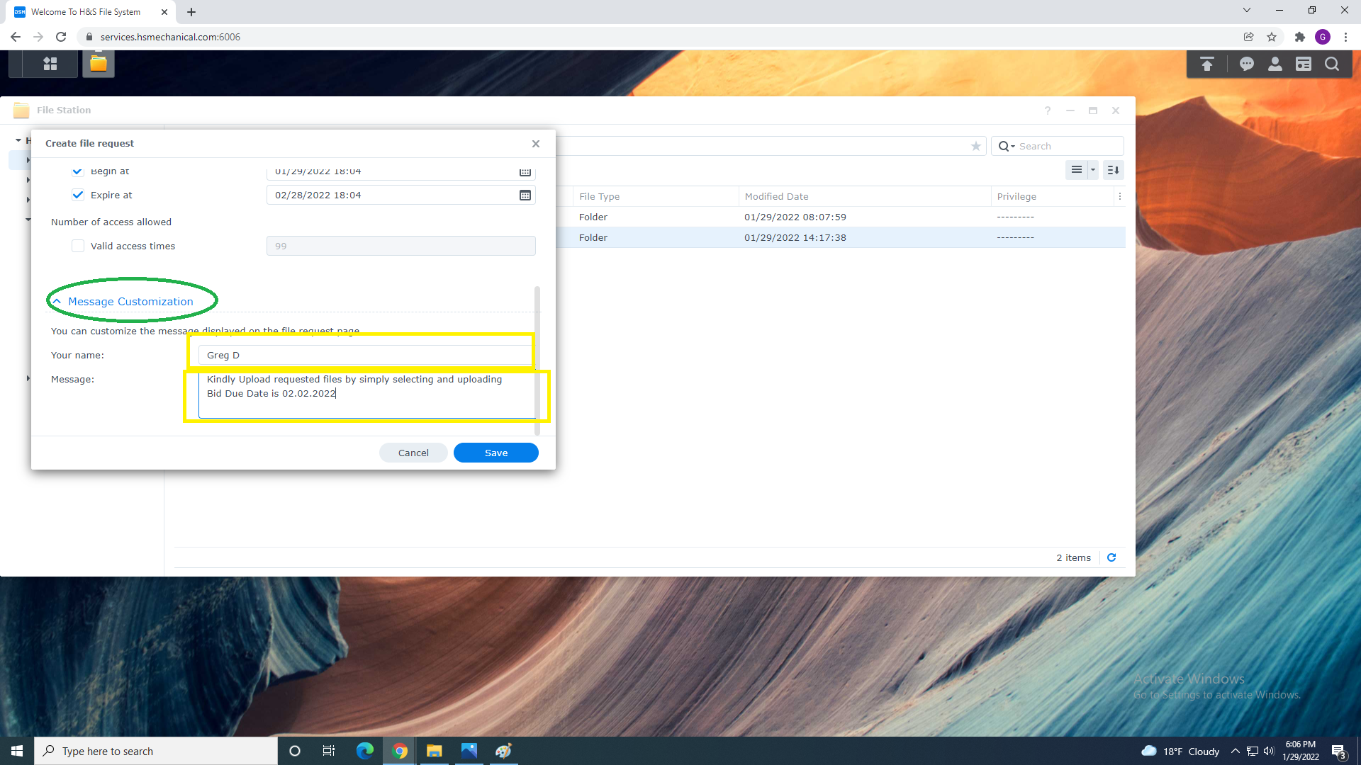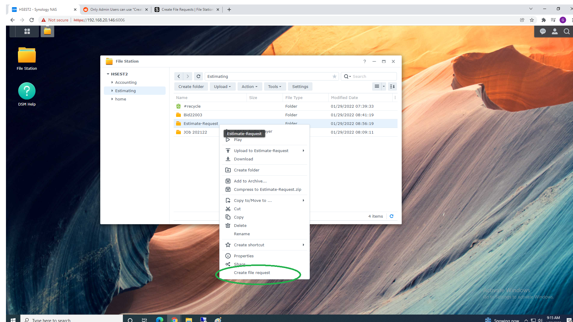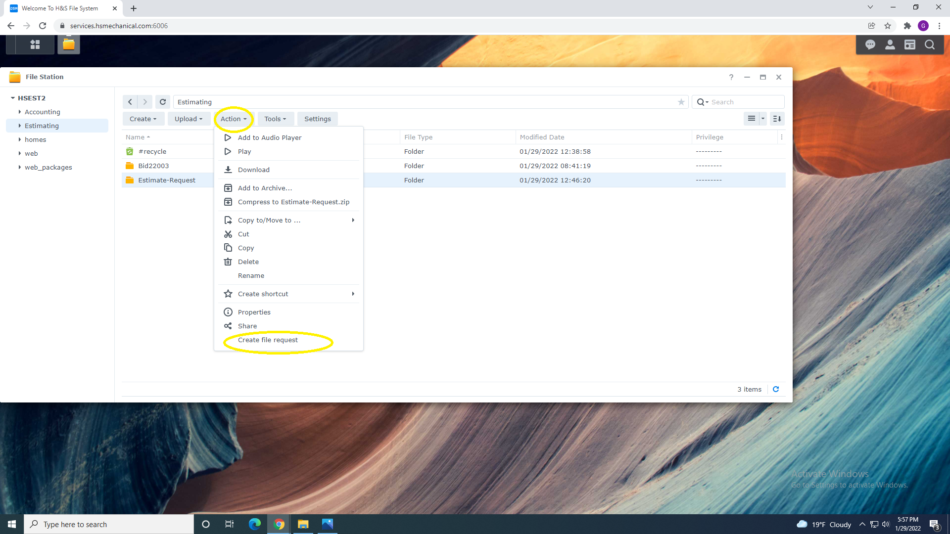 1.First create the folder where you want folders to be uploaded-you can create a sub folder inside under Estimate-Request for a specific job by selecting ‘Create File Request’ from the Action Menu (I might not have this direction correct I read it as that clicking create file request creates a sub folder where the requested files will go when the vendor uploads them)